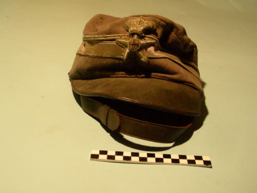 Di forma circolare con visiera prominente e soggolo a cinturino regolabile fissato alle tempie con due bottoni e posizionato sopra la visiera; fregio con stemma della sanità in posizione frontale sovrapposto a doppia banda e doppia profilatura di color argento. Interno foderato di colore azzurro.