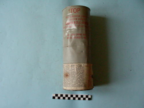 - ISCRIZIONI sulla parte superiore del cilindro - TOP THIS GENERATOR CONTAINS CALCIUM HYDRIDE GENERATOR M-315-B (HYDROGEN) DATE OF MFR. 10-54 LOT NO.1/1757 WT. 1200 GRAMS NET. METAL HYDRIDES INC. - maiuscoli - a stampa in rosso e nero - inglese