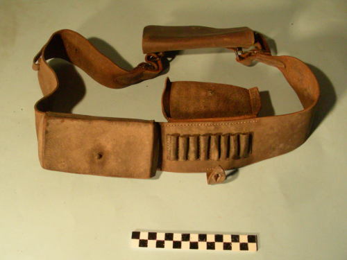 Cinturone con chiusura tramite 2 fibbie e 2 cinturini inseriti nelle magliette di una giberna con ribalta e cinturino per il fissaggio ad un perno inserito alla base. Due giberne posteriori per cartucce di caratteristiche diverse; una a tasca con perno centrale sulla ribalta per la chiusura tramite cinturino con asola cucito all'interno del cinturone; la seconda con ribalta, che copre otto celle porta cartucce, con perno di chiusura centrale e cinturino con asola cucito all'interno del cinturone.Ulteriore fibbia e cinturino d'affardellamento cuciti sul lato sinistro del cinturone.