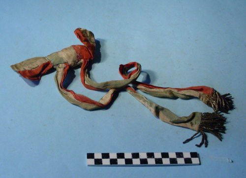 tricolore, a 4 lembi cuciti in un passante imbottito che conserva un anello per il fissaggio. Ai lembi lunghi sono fissate due frange di canottiglia dorata.