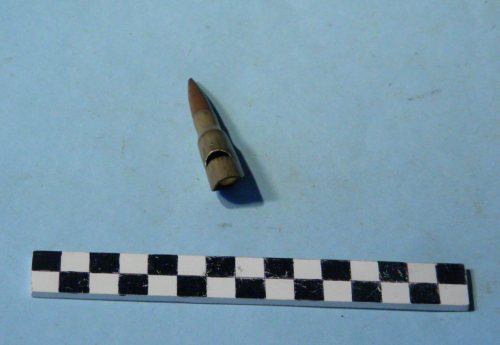 cartuccia 8mm di Lebel con bossolo tagliato diagonalmente con opposto un foro semirircolare.
