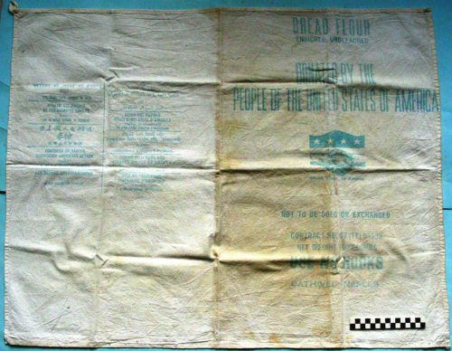 - ISCRIZIONI nella metà destra del telo - BREAD FLOUR ENRICHED, UNBLEACHED DONATED BY THE PEOPLE OF THE UNITED STATES OF AMERICA -------------- due mani destre che si stringono sormontate da 4 stelle a cinque punte in campo azzurro, con sottostante scritta UNITED STATES OF AMERICA NOT TO BE SOLD OR EXCHANGED CONTRACT NO. CT (FF) 53638 NET WEIGHT 100 POUNDS USE NO HOOKS CATHWEL - NAPLES - lettere capitali - a stampa - diverse
