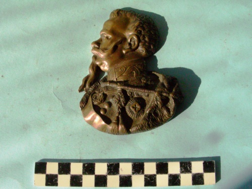 Profilo della testa in rilievo, lato sinistro, con grande uniforme, rosetta sabauda e nodo Savoia.