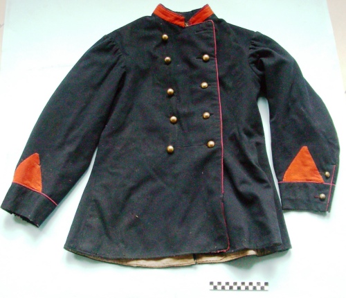 In panno nero, A dpiio petto, chiusura verticale tramite 5 bottoni dorati, con profilo di panno rosso, un gancetto al colletto. Paramani di tela rossa a forma di triangoli sulle maniche prfilate in rosso e due bottoni dorati. Sulle spalle spalline chiuse da un bottone. Colletto di tela rossa. Uno spacco posteriore profilato in rosso e due bottoni dorati sopra a due tasche nascoste ricavate nelle falde posteriori. All'interno fodera di tela pesante di color corda con imbottitura sulle spalle e sotto alle ascelle., Ai lati due taschini.