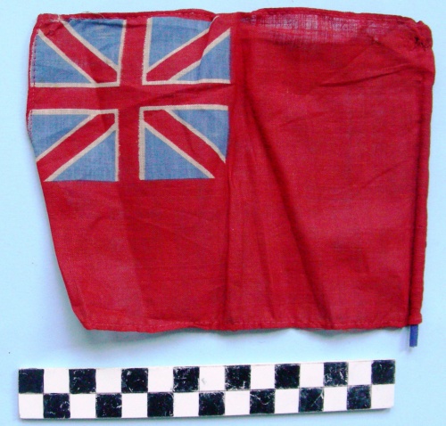 Di colore rosso con "Union Jack" stampata nel primo quarto a sinistra. Asta spezzata di colore blu cucita sul lato corto a destra.