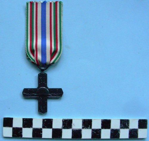 Croce greca piena, incisa, caricata di uno scudetto a forma di stella a cinque punte con scritta. Sul verso un elmetto all'incrocio dei due bracci. Croce sorretta coi colori della bandiera italiana ed una riga azzurra centrale.