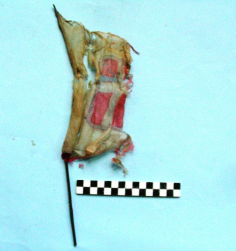 Avvolta ad una piccola asta spezzata. Si intravvede parte di stemma sabaudo