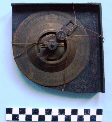 Lastra con due lati a T che formano un angolo retto, gli altri due lati arrotondati. Sulla faccia superiore tre corone concentriche graduate, al centro un tronco di cono graduato girevole con nonio a due bracci per la lettura dei dati, fissato al centro da un dado a galletto e lateralmente da una vite zigrinata. Sulla faccia posteriore una cremagliera con barra e rocchetto dentati ed ulteriore vite di fissaggio.