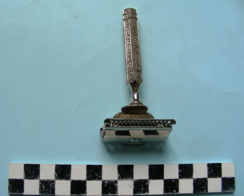Impugnatura esagonale decorata a rilievo. Testina con chiusura a scatto per il fissaggio della lametta, banda pulitrice a griglia sulla parte inferiore.