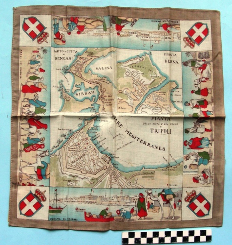 Di forma quadrata a stampa policroma. Ai quattro angoli scudo sabaudo coronato. Ai quattro lati scene di vita locale "VEDUTA DI TRIPOLI", "COSTUMI TRIPOLITANI", "BENGASI - LA MARINA", "ARABI IN MARCIA". Al centro nel primo quarto a sinistra " PORTO e CITTA' DI BENGASI - SALINA - SIBBAH". Nel secondo quarto a destra "PIANTA DI DERNA". Nei due quarti inferiori "PIANTA DELLA CITTA' E DEL PORTO DI TRIPOLI".