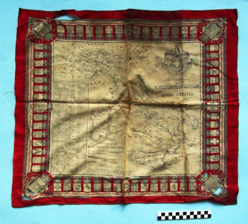 Di forma rettangolarea stampa policroma. Perimetro bordato in rosso. All'interno, lungo i quattro lati sono raffigurati gli stemmi delle città italiane, ai quattro angoli ed al centro dei lati, di dimensioni maggiori, in senso antiorario quelli di Roma, Firenze, Napoli, Genova, Torino, Palermo, Milano e Venezia. Al centro la piantina dell'Italia suddivisa in circoscrizioni, con segni convenzionali e legenda. Angolo superiore destro con scudo Sabaudo con arazzi e figure antropomorfe. A sinistra una tabella identificativa.