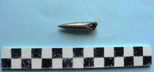 Di forma conica, ogiva intatta, non sparata, cal. 8 mm., con foro circolare in coda.