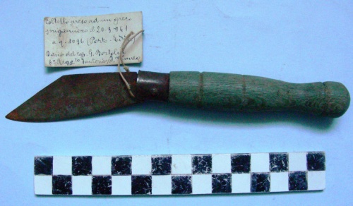 Lama mobile ripiegabile nel manico, ad un filo, incernierata nell'impugnatura, senza bloccaggio di sicurezza. Manico terminante con un pomolo, con lungo taglio verticale per l'inserimento della lama, anello aperto al vertice fissato con un chiodo ribattuto.