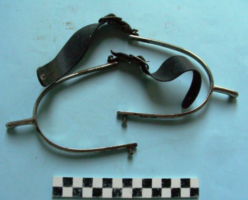 Di forma semiellittica, con due bracci terminanti con un perno sui quali è fissato un solo lacciolo a forma di losanga con fori e fibbia per la regolazione e fissaggio. Al centro dell'arco lungo gambo a goccia.