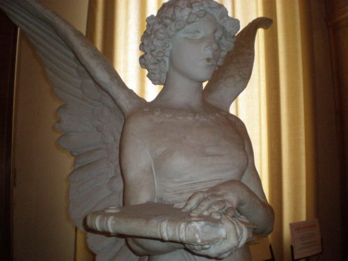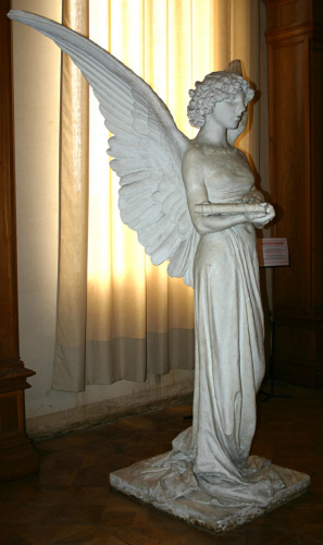 - NOTIZIE STORICO CRITICHE La figura angelica, asessuata e fortemente ieratica, si impone quale presenza metafisica atta a sorregge il libro del destino. Una leggera veste a tubino, cinta al seno, lascia scoperte le spalle e le braccia, mentre le pieghe ricadono dolcemente a spirale. Giulio Monteverde è stato uno dei più famosi e celebrati scultori italiani dell'Ottocento, tanto da esser nominato senatore del Regno d'Italia nel 1889, per meriti artistici. Dopo un iniziale discepolato presso la bottega di Giovanni Bistolfi, padre di Leonardo, a Casale Monferrato, si trasferisce a Genova, dove frequenta l'Accademia di Belle Arti sotto la guida di Santo Varni, per poi completare gli studi a Roma. Tra le sue opere più note si annoverano il "Cristoforo Colombo giovinetto" (1870, il marmo si conserva a Venezia in Palazzo Giovanelli), con cui si impose all'attenzione del pubblico e della critica, il "Genio di Franklin" (1872) e il gruppo di "Jenner che innesta il vacino del vaiolo al figlio" (1873), che ne decretò la consacrazione artistica. Monteverde, nel prosieguo della sua carriera, si distinse soprattutto nella realizzazione di statue e monumenti celebrativi o funerari. In questo caso, l'opera in esame si qualifica come modello per la statua eseguita dallo scultore per il Mausoleo della famiglia Camerini nel cimitero padovano dell'Arcella. Poco dopo la realizzazione di quest'opera, lo scultore fu invitato a far parte del comitato di patrocinio della prima Biennale di Venezia (1895), per la sezione italiana. Nella Gipsoteca Giulio Monteverde di Bistagno si conserva un gesso consimile, mutilo, però, di parte delle ali (S. Arditi - L. Moro, La Gipsoteca Giulio Monteverde di Bistagno, Bistagno 1987, p.32, n. 8). Sempre in riferimento a Giulio Monteverde, la Guida della villa del 1926 segnalava la presenza di un "Progetto" in terracotta per il monumento alla Duchessa di Galliera in Genova, oggi non più rintracciabile.
