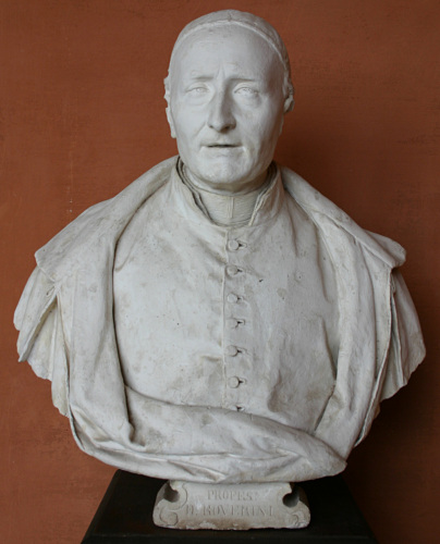 - NOTIZIE STORICO CRITICHE Spinto per vocazione al sostegno dei bisognosi, don Domenico Roverini nel 1857 fu richiamato "ad pedes" dal vescovo di Padova per un suo discorso, che venne dichiarato lesivo nei confronti del vescovo ed eccitante alla ribellione. In questo discorso, pronunciato nel luglio del 1857 in una casa di ricovero, il prelato "insisteva sul dovere dei ricchi di dare il superfluo della loro ricchezza ai poveri, con accento declamatorio e polemico contro lo sperpero del denaro delle classi agiate" (A. Gambasin, Il clero padovano e la dominazione austriaca 1859-1866, Roma 1967, p. 268). Ceccon, rientrato dal soggiorno romano, nel tradurre in gesso le fattezze del canonico si sofferma sull'espressione bonaria del volto e sulla ripresa, fedele e ben calibrata, dei tessuti.