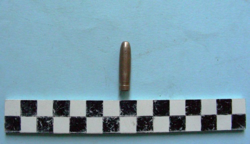 Di forma cilindrica, argentato, con ogiva conica arrotondata. anello di crampatura a circa un quinto. Base concava.