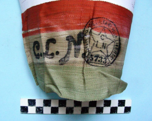 Rettangolo di stoffa con bande rossa, bianca e verde con i due lembi cuciti per essere infilata ad un braccio.