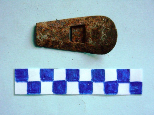 Lamiera concava a forma di goccia ripiegata verso l'esterno. La parte centrale è stata tagliata e ripiegata verso l'interno a formare una linguetta di fissaggio.