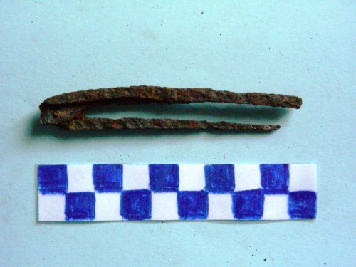 Due bracci fissati al vertice da un perno. Un braccio appuntito, sull'altro sono state appicate due ulteriori lamine fissate al centro da un perno.