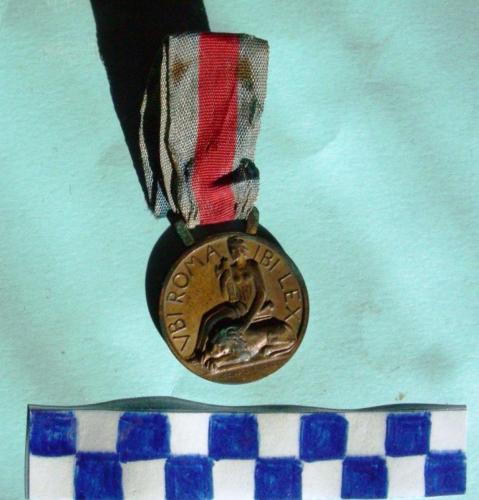 Disco inciso recante sul diritto l'Italia turrita rivolta a sinistra, seduta sul trono con un fascio nella mano destra e nell'atto di accarezzare un leone accovacciato ai suoi piedi, scritta lungo la corona. Sul verso tra scritte, in alto un nodo Savoia, in basso due fucili incrociati con bomba sovrastante al centro e corona reale . Il nastro è composto da due strisce azzurre ai lati ed una striscia rossa al centro..