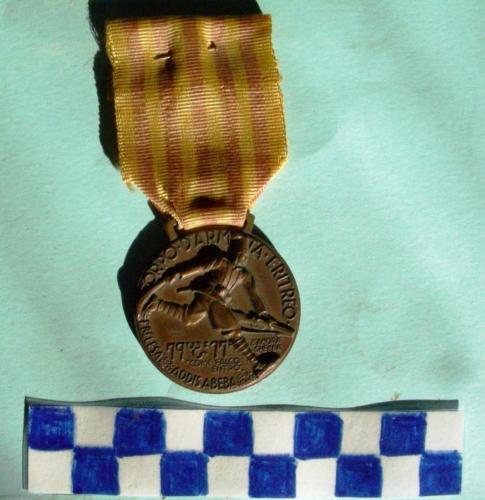 Disco di metallo, sul dritto in rilievo ascaro che corre verso destra, con fez, fucile nella mano sinistra e sciabola nella mano destra portata all'indietro, diverse scritte sulla corona e sulla faccia della medaglia Sul verso nella parte superiore piccola stella a cinque punte, numerose scrittae al centro, due fasci littori rivolti verso l'esterno e nodo Savoia in basso. Nastro con 6 strisce gialle intervallate a 5 strisce rosse.