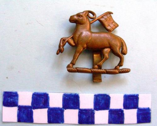 Distintivo a forma di Agnus Dei dorato con aureola rivolto a sinistra che porta nella zampa destra alzata l'asta di una bandiera con croce. Sul verso linguetta di fissaggio.