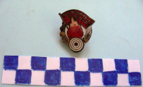 Distintivo smaltato, partendo dal basso: un bersaglio di colore bianco con cerchi concentrici, alla sua sinistra sula corona una ruota dentata con iscrizione, a destra una spiga di grano. Sul bersaglio una fiamma smaltata che sormonta l'asta di una bandiera rossa con iscrizione. Sul retro una vite di fissaggio e disco di chiusura con iscrizione e matricola.