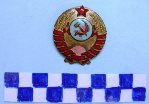 Distintivo di forma ovoidale smaltato. Nella metà inferiore un nastro di colore rosso lega a destra ed a sinistra due fasci di grano che continuano verso il vertice dove sono divisi da una stella rossa a cinque punte. Al centro, nella parte bassa, un sole nascente con fasci di raggi, nella parte centrale un disco di colore azzurro con una falce e martello dorati sovrapposti ad una mappa stilizzata di colore rosa. Nella parte posteriore due linguette per il fissaggio.