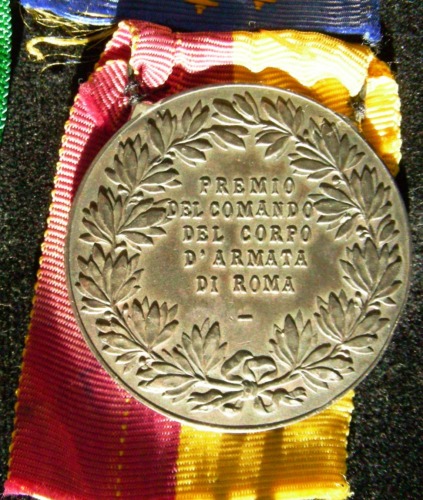 Disco di metallo. Sul dritto, in rilievo, il profilo di Vittorio Emanuele III a capo scoperto e volto a destra. Sul verso iscrizione tra due rami d'alloro legati in basso da nastrino. Nastro bipartito giallo e rosso.