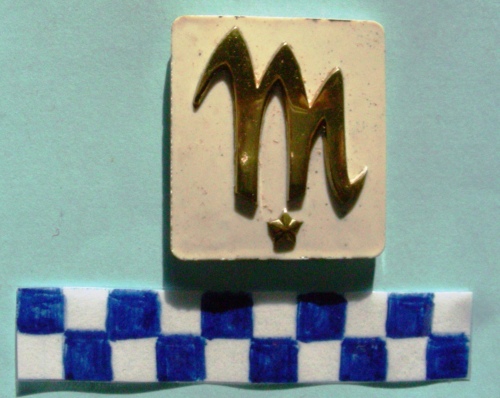 Su una base rettangolare di colore bianco monogramma e stelletta sottostante entrambi dorati. Sulla faccia posteriore tre linguette per il fissaggio.