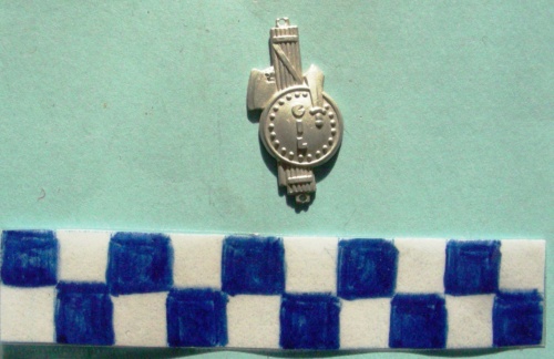 Scudo con borchie lungo la corona, una daga rivolta verso l'alto, sporgente oltre lo scudo sul lato destro, al centro iscrizione verticaledall'alto verso il basso, il tutto sovrapposto ad un fascio littorio. Due occhielli di fissaggio sui lati corti del fascio littorio.