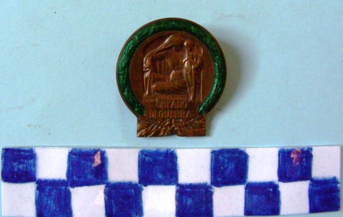Sul dritto lungo la corona foglie d'alloro ricoperte da smalto verde. Al centro in rilevo una figura di donna velata, seduta, che regge il velo con il braccio destro spiegato ed una figura di bimbo in piedi alla sua sinistra. Iscrizione sottostante e due rami d'alloro incrociati alla base. Sul verso una spilla di fissaggio ed iscrizione.
