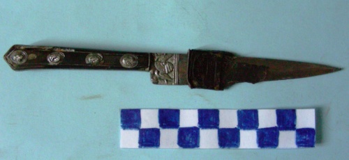 Di piccole dimensioni, l'impognatura e la coccia stondata sono ricoperte da una lamina incisa a motivi floreali. Su ogni guancetta sono applicati 4 piccoli busti in rilevo. Lama ad un filo terminante a punta, i due lati del tallone sono ornati da trofei d'armi in rilievo. Si conserva solo la cappa del fodero