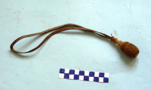 Con cordoncino piatto dorato e screziato in nero; nappa terminale a losanghe e canottiglia dorate a coprire la noce.