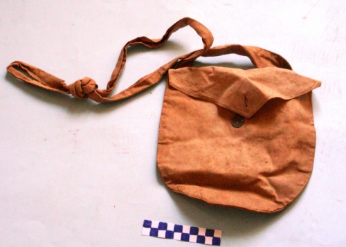 Di forma rettangolare con base molto arrotondata, patta a forma triangolare con asola centrale per chiusura tramite bottone applicato sul corpo. Piccolo taschino rettangolare cucito all'interno con patta triangolare. Lunga tracolla cucita alle estremità del lato superiore.