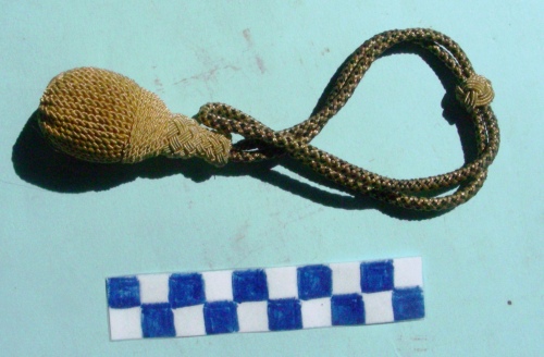 Cordoncino dorato, screziato in nero, con nottolino in filo dorato e terminante con noce decorata con fili dorati.