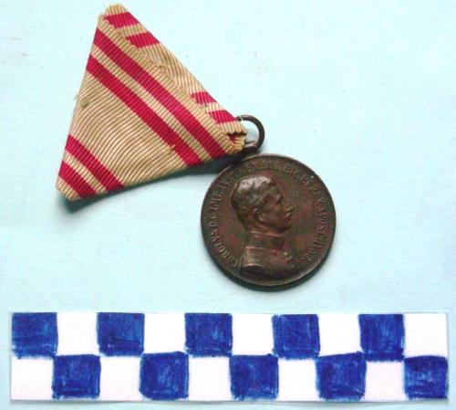 Di forma circolare, sul recto il busto dell'imperatore, in grande uniforme, in rilievo, a destra. Iscrizioni lungo la corona e sotto la spalla destra. Sul verso trionfo di bandiere sormontate da corona d'alloro, iscrizione al centro. Nastrino ripiegato a formare un triangolo con strisce rosse su fondo bianco.