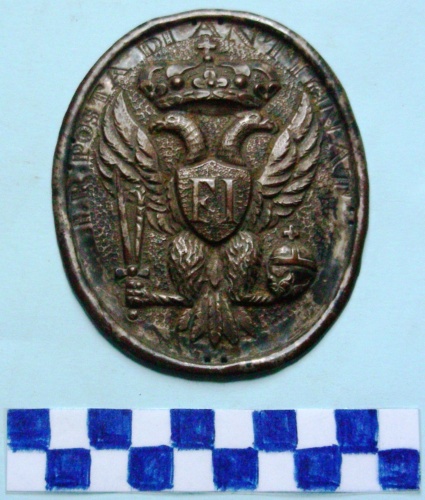 Di forma ovale leggermente convessa. Al centro, in rilievo, aquila bicipite coronata che stringe nella zampa desta la spada e lo scettro, nella zampa sinistra il globo. Al centro del petto scudo con monogramma. Iscrizione lungo la parte superiore della corona circolare. Quattro gruppi di due fori ai lati per il fissaggio.
