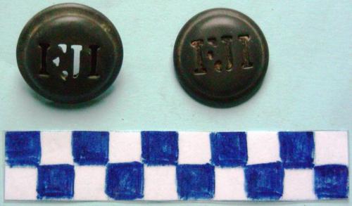 Fregio circolare bombato con due anelli/spille sul retro per il fissaggio; la parte centrale è rialzata.