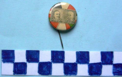 Fregio circolare con al centro, sovrapposto a spicchi con i colori dell'impero Austro-Ungarico e tesesco, in due rettangoli, i ritratti di fronte di Francesco Giuseppe e Guglielmo II. Sul verso spilla di fissaggio.