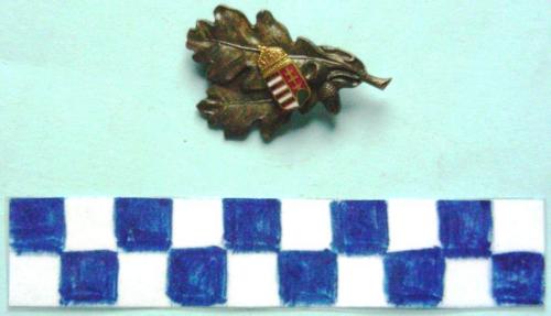 A forma di due foglie di quercia con una ghianda ed una cupola. al centro stemma del regno d'Ungheria fissato con un rivetto. Sul verso spilla per il fissaggio.
