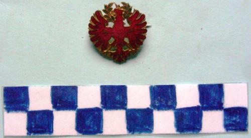 Di forma circolare, aquila coronata ad ali spiegate di colore rosso su base dorata con rami d'alloro intorno alla testa. Sul verso spilla per il fissaggio.