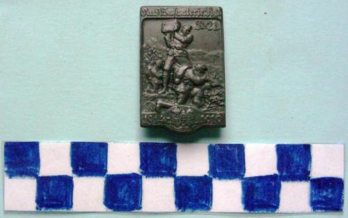 Di forma rettangolare. Al centro in rilievo verso destra due soldati inginocchiati nell'atto di sparare un fucile verso il basso, alle loro spalle un ulteriore soldato in piedi, nell'atto di scgliare un masso. Iscrizione sul lato superiore. Nella parte inferiore un cartiglio con iscrizione e gli stemmi araldici dell'Austria-Ungheria. Sul verso iscrizione e gancio di fissaggio.