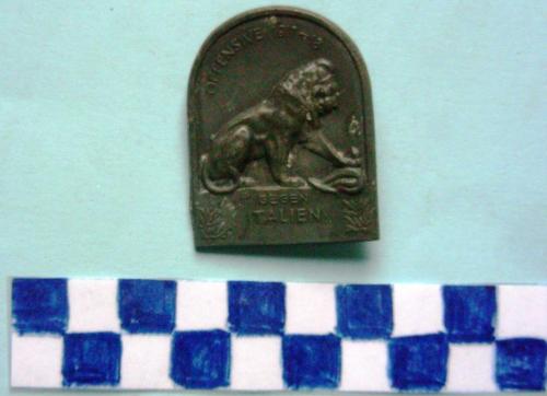 Di forma rettangolare con lato superiore arrotondato. al centro in rilievo, a destra, un leone nell'atto di schiacciare una serpe. Iscrizioni lungo la corona e in rettangolo con decorazioni floreali sul lato inferiore. Sul verso spilla di fissaggio.