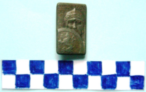 A forma rettangolare. Bassorilievo del volto di un soldato, con elmo incoronato d'alloro, parzialmente sormontato da uno scudo, recante un leone rampante. Iscrizone lungo il lato superiore. Sul verso, spilla di fissaggio e ulteriore iscrizione.