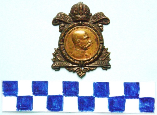 A forma di disco centrale, riportante al centro il profilo, in rilievo a destra di Francesco Giuseppe, sormontato da corona imperiale e cartiglio con iscrizioni. Nella parte inferiore, iscrizione.