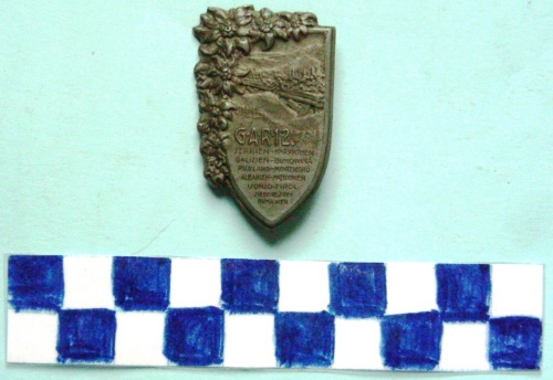 A forma di scudo decorato da stelle alpine sui lati superiore e sinistro. Al centro, in rilievo un paesaggio alpino con abeti ed in primo piano un reticolato. Iscrizione nella parte inferiore. Sul verso, spilla di fissaggio.