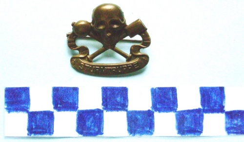 A forma di spilla con teschio in rilievo sovrastante due bombe a mano con i manici incrociati. Nella parte inferiore un cartiglio con iscrizione. Sul verso spilla di fissaggio.