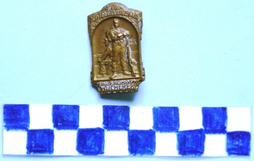 Di forma rettangolare. Al centro, in rilievo un soldato in piedi, con zaino e braccio sinistro appuggiato alla bocca di un fucile. Alle spalle un marinaio seduto che guarda verso sinistra. Iscrizioni sui lati superiore ed inferiore. Sul verso spilla di fissaggio ed iscrizione.